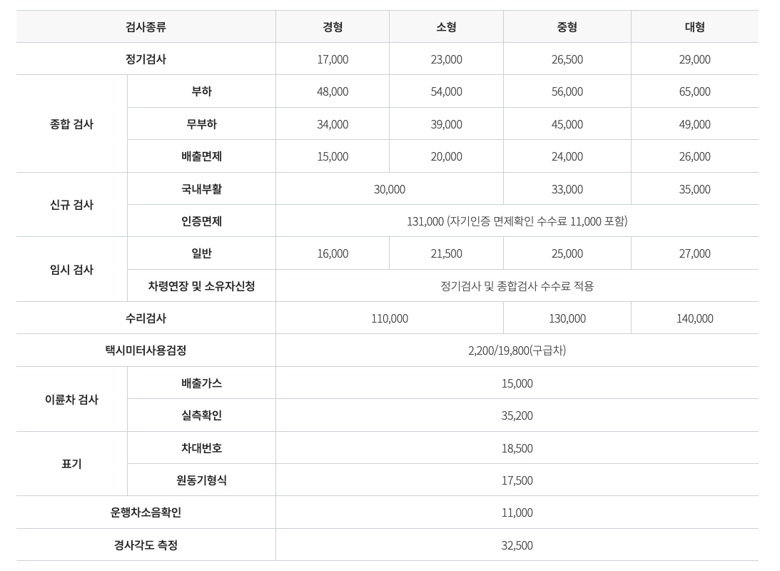 | 차종 | 검사 요금 | 비고 |